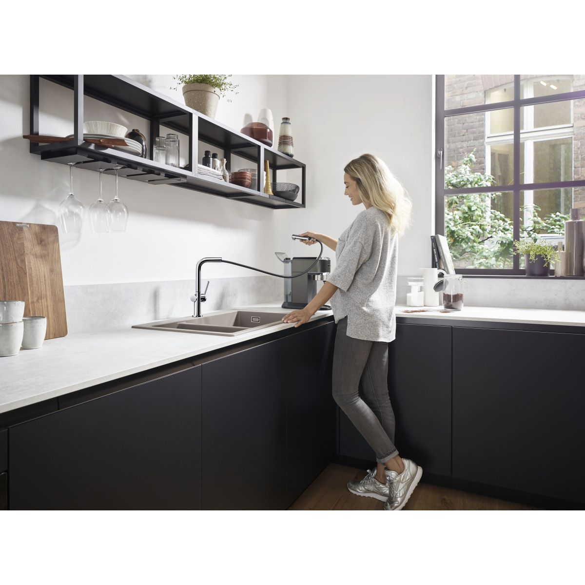 Der 50 cm lange Auszugauslauf bringt das Wasser dorthin, wo es gebraucht wird. Dank einer Durchflussmenge von bis zu 7 l/min lassen sich auch große Töpfe schnell und bequem befüllen. Wenn der Auszugauslauf nicht mehr benötigt wird, lässt er sich dank eines Magnetmechanismus (MagFit) wieder einschieben. Die Durchflussmenge und die Wassertemperatur werden über ein langlebiges Keramikmischsystem von hansgrohe geregelt.