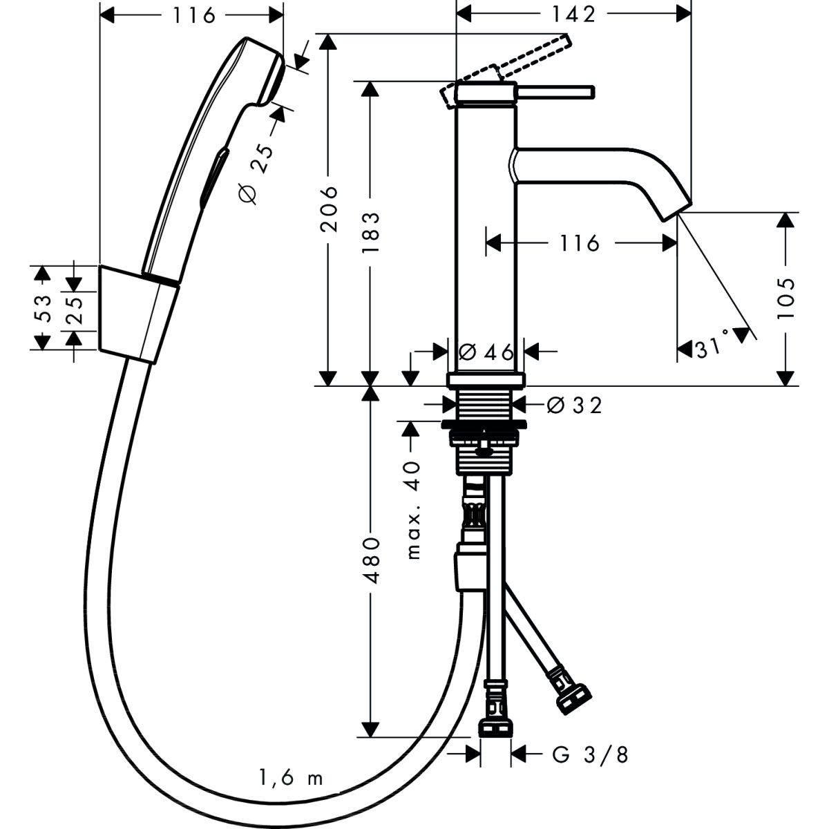 - Bestehend aus: Einhebel-Waschtischarmatur, Bidette-Duschkopf, Duschhalter, Duschschlauch
