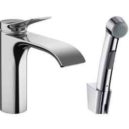 Das Set besteht aus: Einhebel-Waschtischarmatur, Bidette-Duschkopf, Duschhalter, Duschschlauch, Ablaufgarnitur.