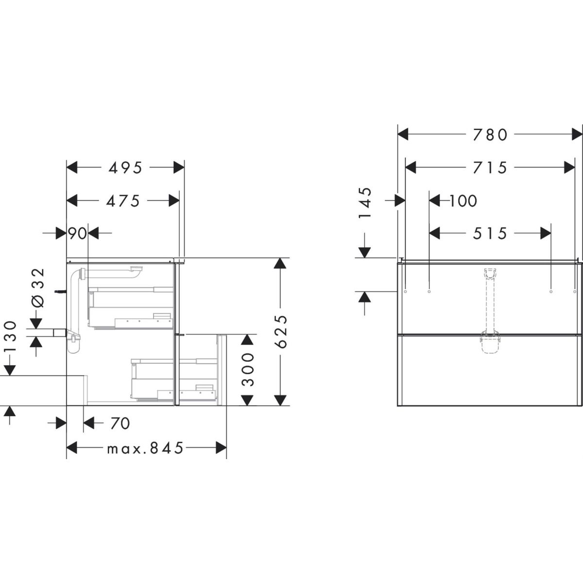 - Im Lieferumfang enthalten: Waschbeckenunterschrank, Set mit Grundbehältern, platzsparender Siphon (mit 50 mm Wasserverschluss)