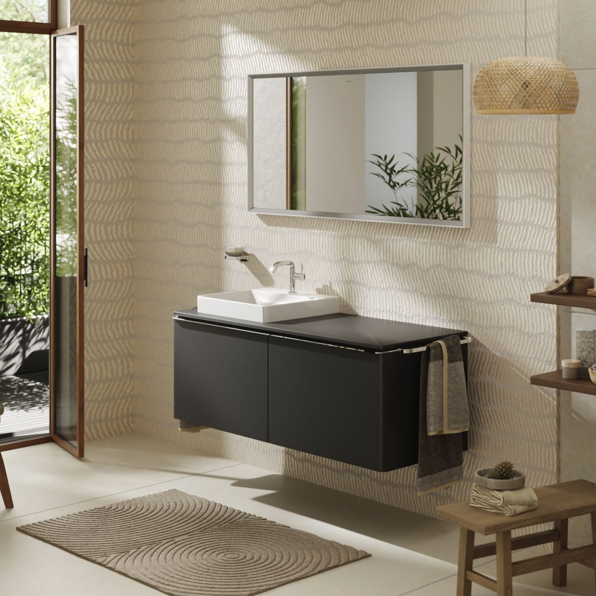 Der große Ablagebereich auf der rechten Seite des Waschbeckens fällt sofort ins Auge. Es ist ein geräumiger Platz, an dem wichtige Badaccessoires und Kosmetika untergebracht werden können. Die Arbeitsplatte selbst besteht aus einer verdichteten, dreischichtigen Spanplatte, die aus nachhaltiger Forstwirtschaft stammt. Wie alle anderen Materialien der hansgrohe Badmöbel ist auch dieses perfekt für die feuchten Bedingungen im Badezimmer geeignet.