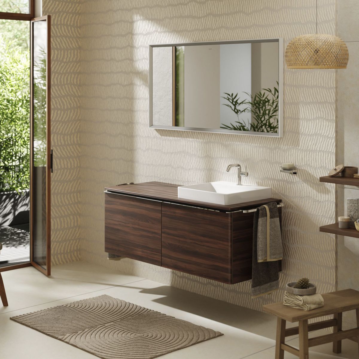 Der große Ablagebereich auf der linken Seite des Waschbeckens fällt sofort ins Auge. Es ist ein geräumiger Platz, an dem wichtige Badaccessoires und Kosmetika untergebracht werden können. Die Arbeitsplatte selbst besteht aus einer verdichteten, dreischichtigen Spanplatte, die aus nachhaltiger Forstwirtschaft stammt. Wie alle anderen Materialien der hansgrohe Badmöbel ist auch dieses perfekt für die feuchten Bedingungen im Badezimmer geeignet.