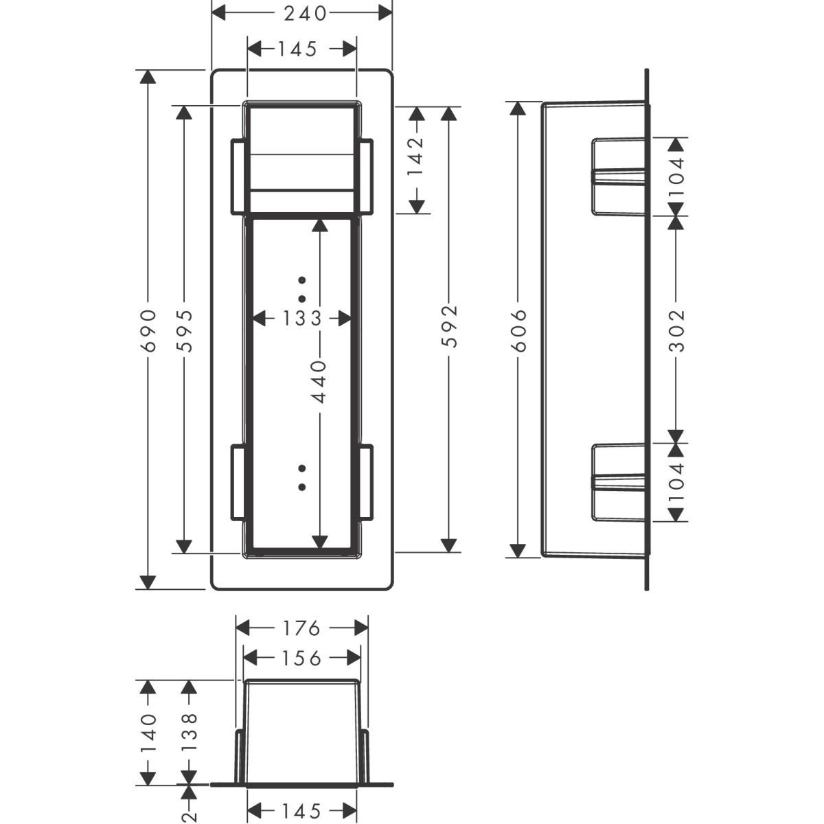 - Abmessungen der Wandaussparung: 595 x 145 x 140 (H x B x T)