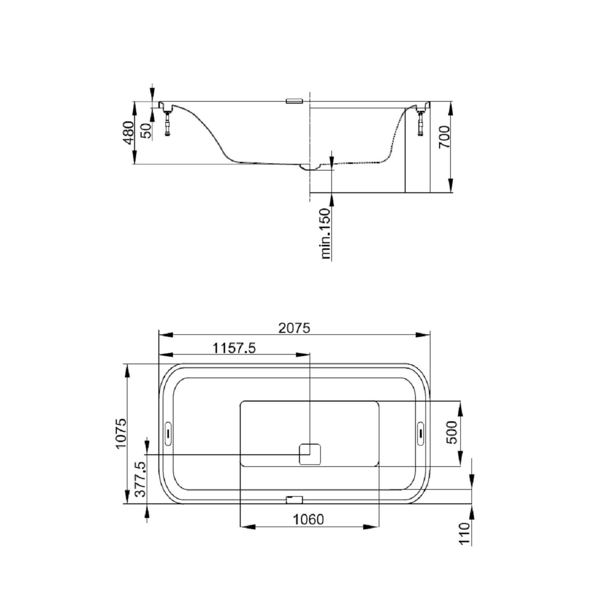 - Die Badewanne enthält ein Bedienfeld, einen elektrischen Abfluss, einen Überlauf und einen Rahmen