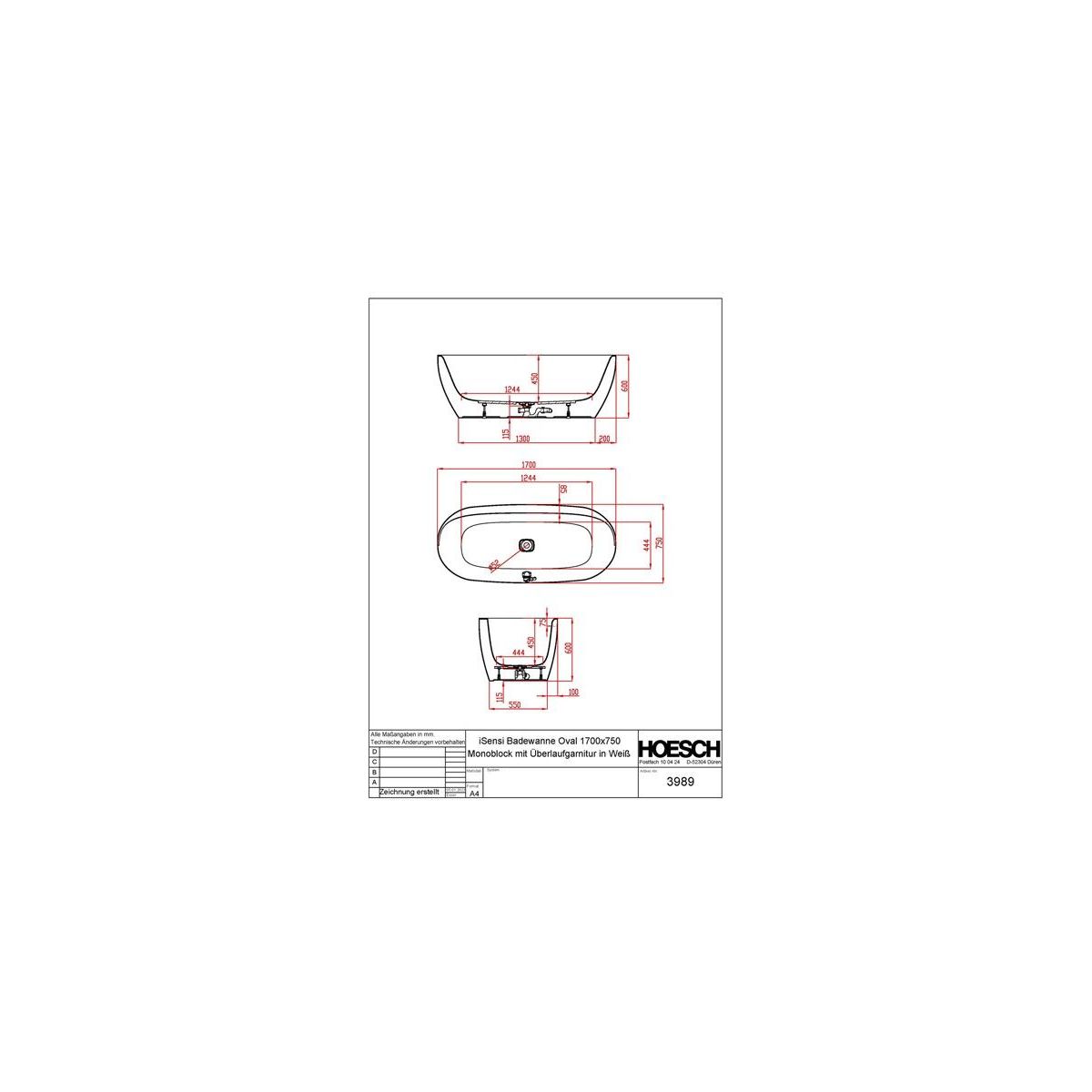 Hoesch iSensi Freistehende Badewanne 170x75 cm oval weiß 3989.010