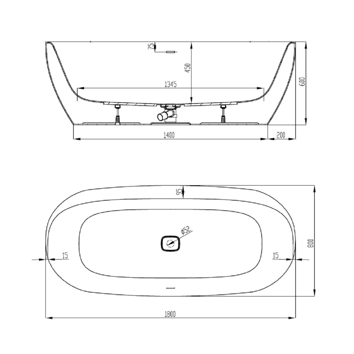 Die komplette ovale freistehende Badewanne umfasst: integriertes Überlaufsystem, Abflusssystem mit Klick-Klack-Stopfen, Verbindungsschlauch.