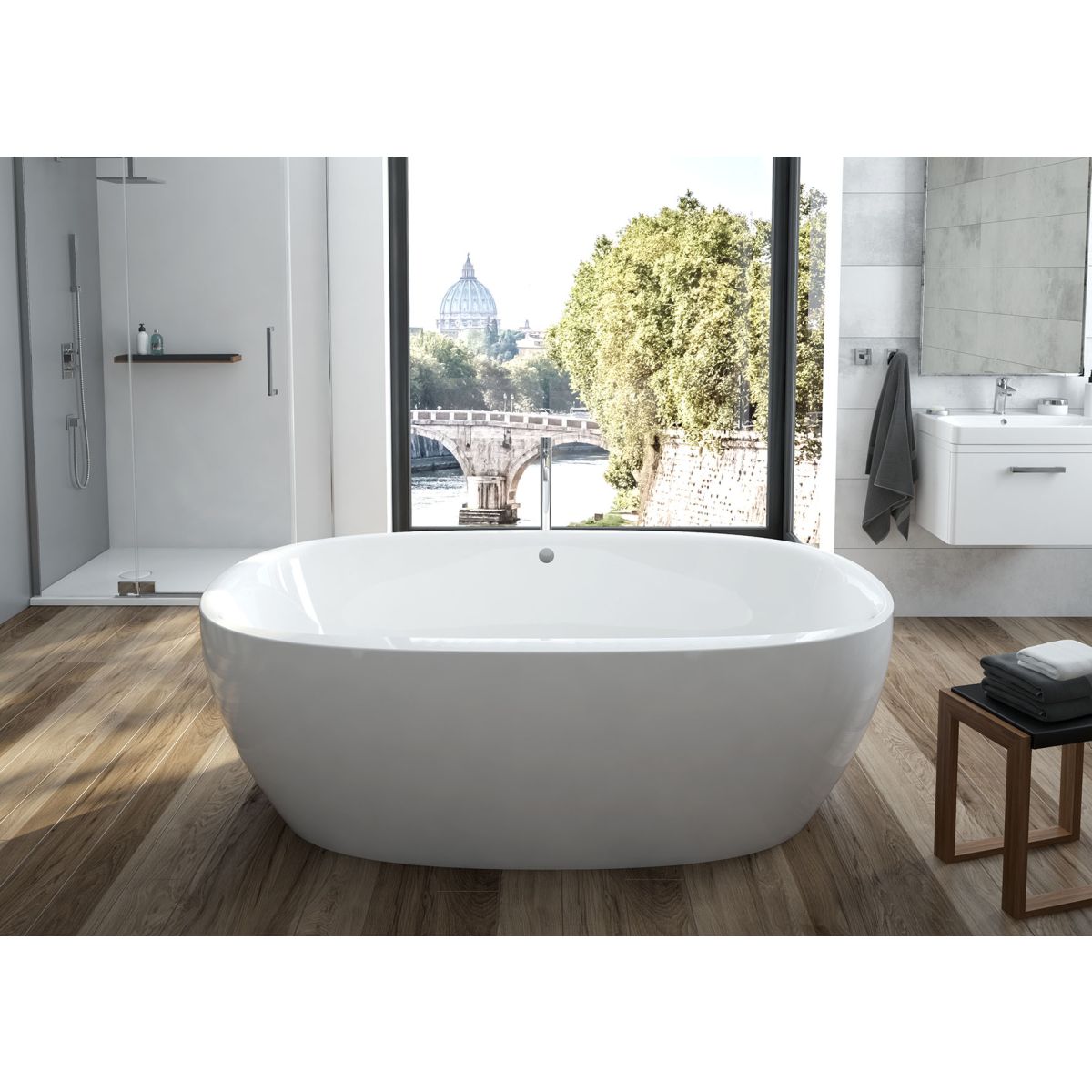Die komplette freistehende ovale Badewanne enthält: integriertes Überlaufsystem, Abflusssystem mit Klick-Klack-Stopfen, Verbindungsschlauch.