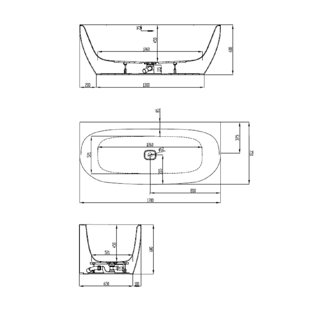 - symmetrische Wandbadewanne komplett mit weißem Schlitzüberlauf
