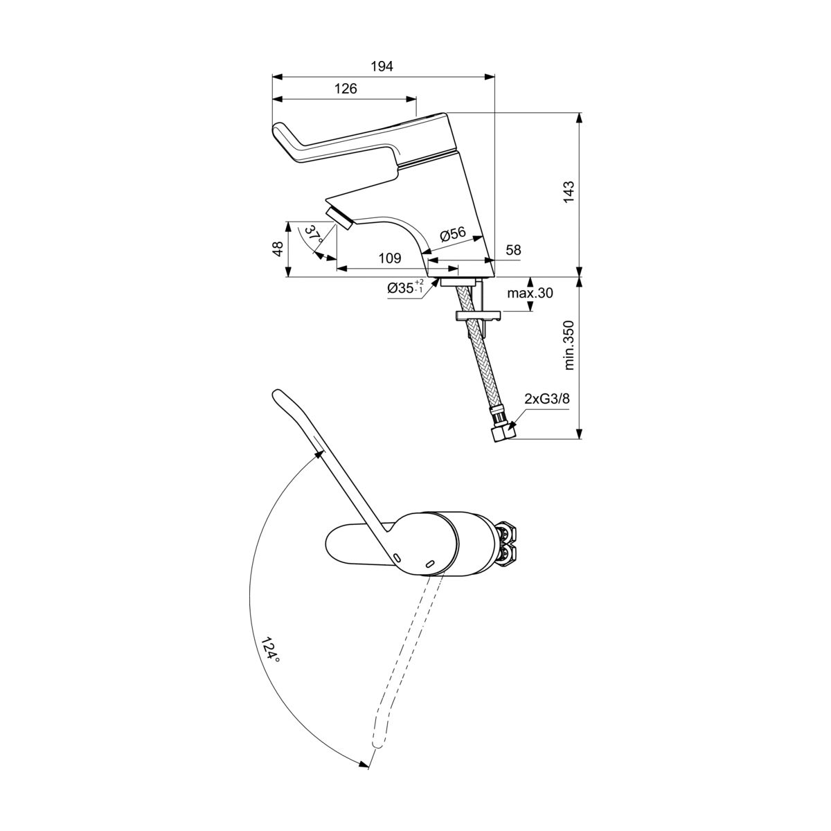 - Regulierung von Öffnen/Schließen und Warm-/Kaltwasser durch Bewegung des Griffs in einer Ebene