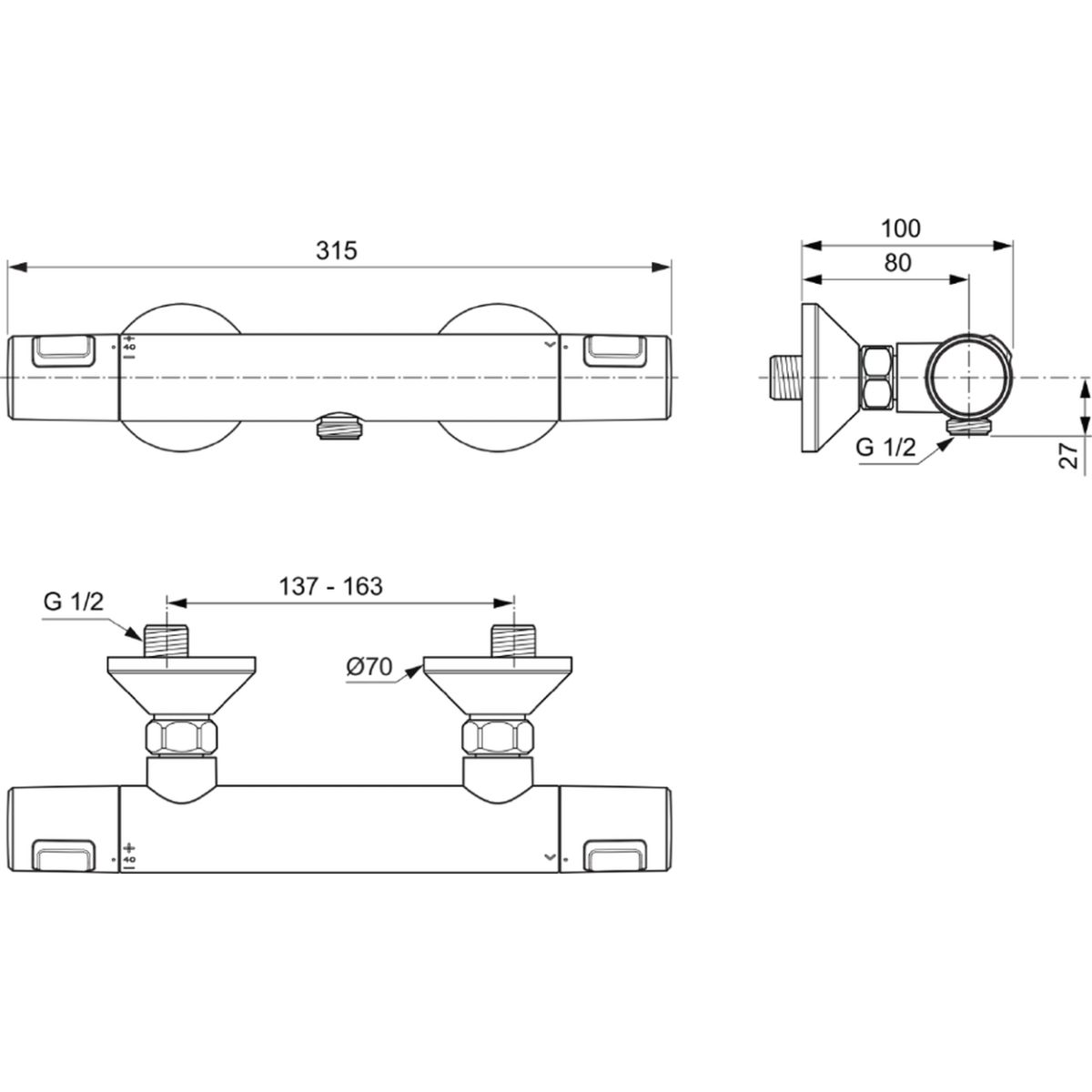 Thermostatische Wandbrause Ceratherm T25. Standard-Exzenteranschlüsse. Thermostatkopf IS mit neuer Technologie. Keramikventil G1/2 180°. Ohne Zubehör im Lieferumfang. Griff mit Temperaturbegrenzer bis 40 °C und Knopf zur Reduzierung des Durchflusses um 50 %. Rückschlagventil.