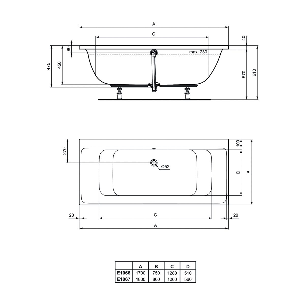 - Siphonöffnung: Ø 52 mm