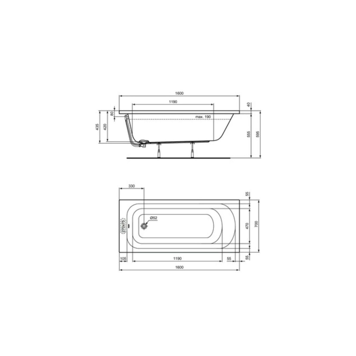 - zum Einbau - zu ergänzen mit: universellem Beinset für Badewannen (C896067), Ablauf- und Überlaufset sowie Siphon Ø52 mm (B4812AA), mit Frontblende (W004801) und Seitenblende (W005101)