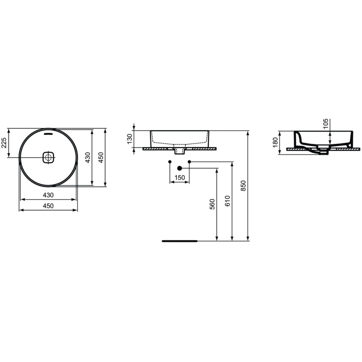 - inklusive weißer Keramik-Ablaufabdeckung T854601, Schablone zum Ausschneiden der Öffnung in der Arbeitsplatte und Montageset