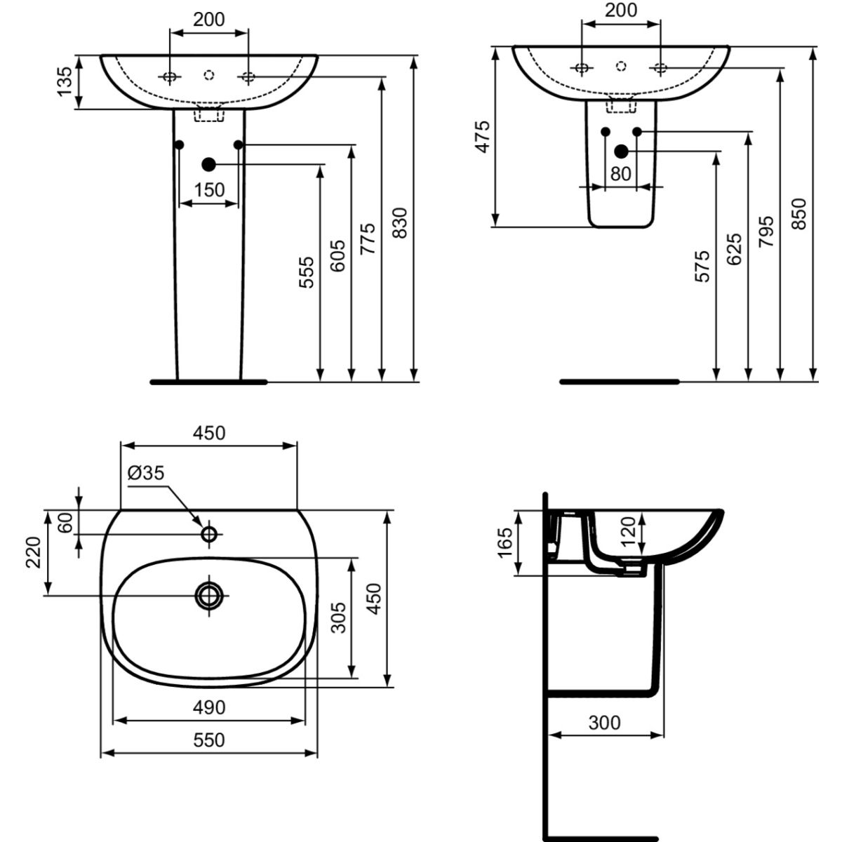 Kann mit dem Sockel T033501, dem Halbsockel T033401 oder separat mit einem Siphon montiert werden.