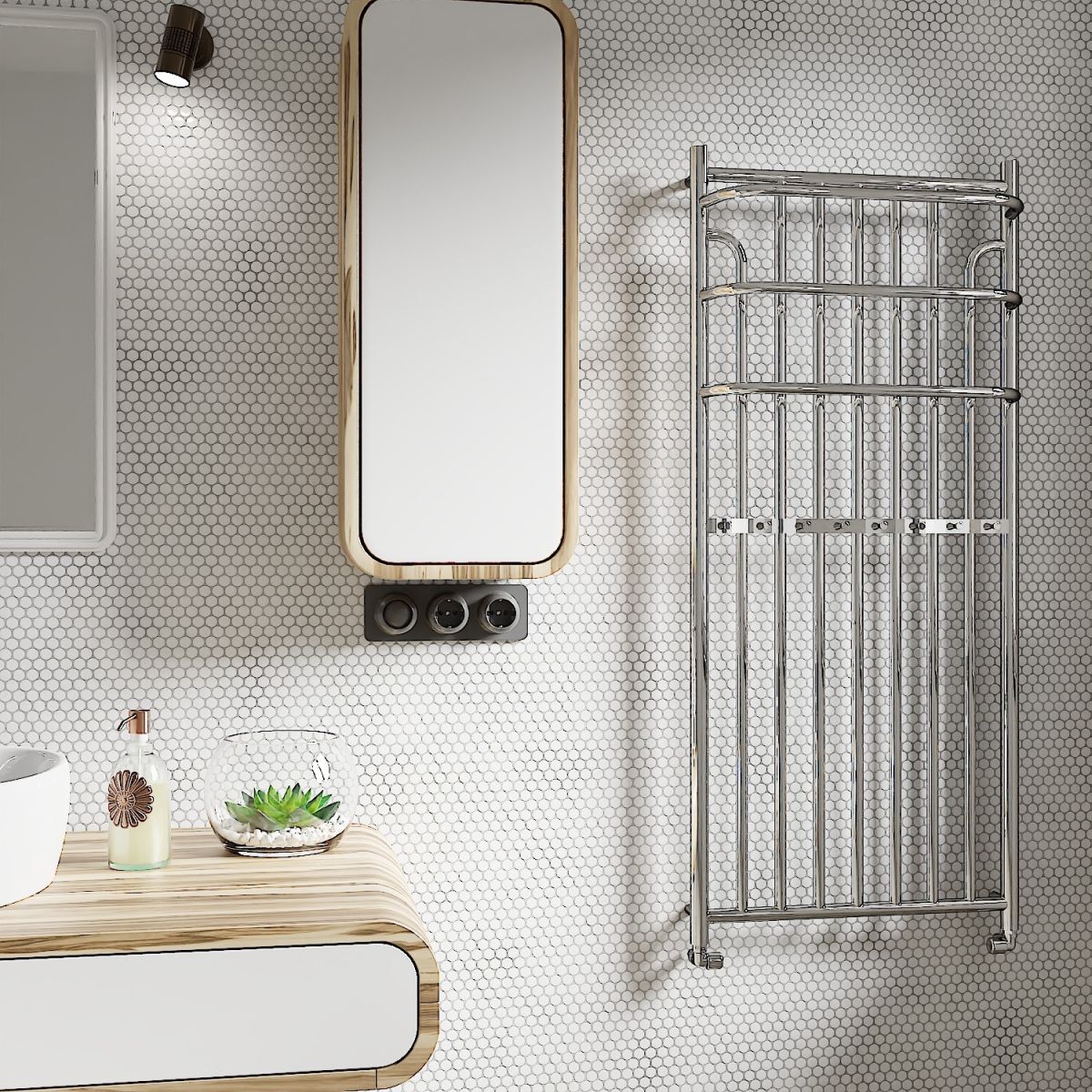 Ein moderner Heizkörper mit dekorativem und praktischem Charakter. Das einzigartige Design und die charakteristischen drei Dipole zeichnen sich durch eine dynamische Form mit vielen praktischen Eigenschaften aus. Stilvoll und gleichzeitig funktional, vollständig aus rostfreien Materialien wie Kupfer und Messing gefertigt.