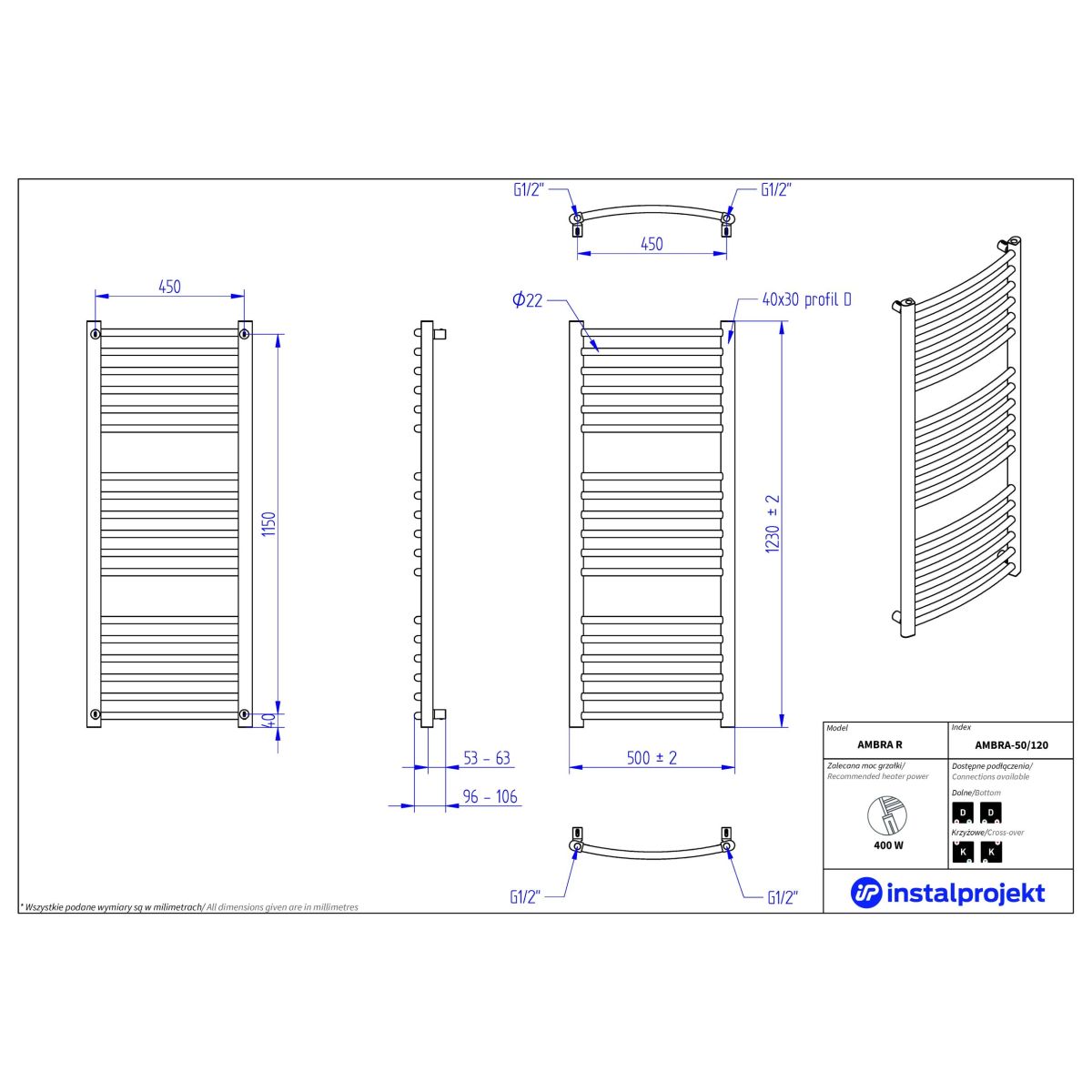 Instal Projekt Ambra R Badezimmerheizkörper Leiter 123x50 cm weiß AMBRA-50/120