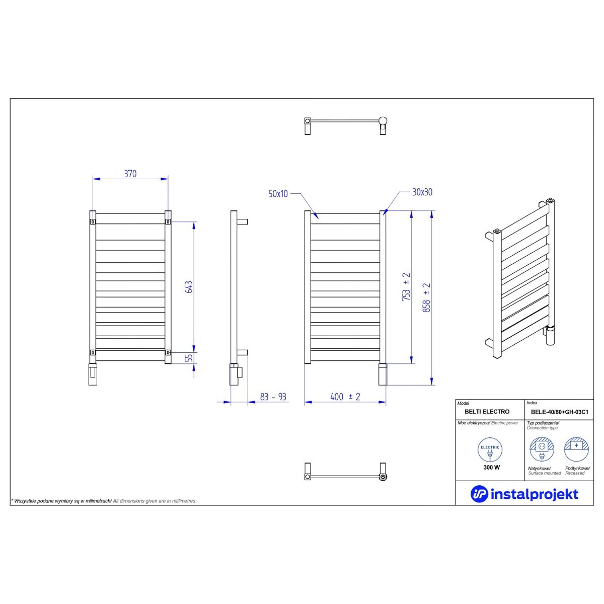 Instal Projekt Belti Electro Elektrischer Heizkörper 75.3x40 cm weiß BELE-40/80+GH-03C1