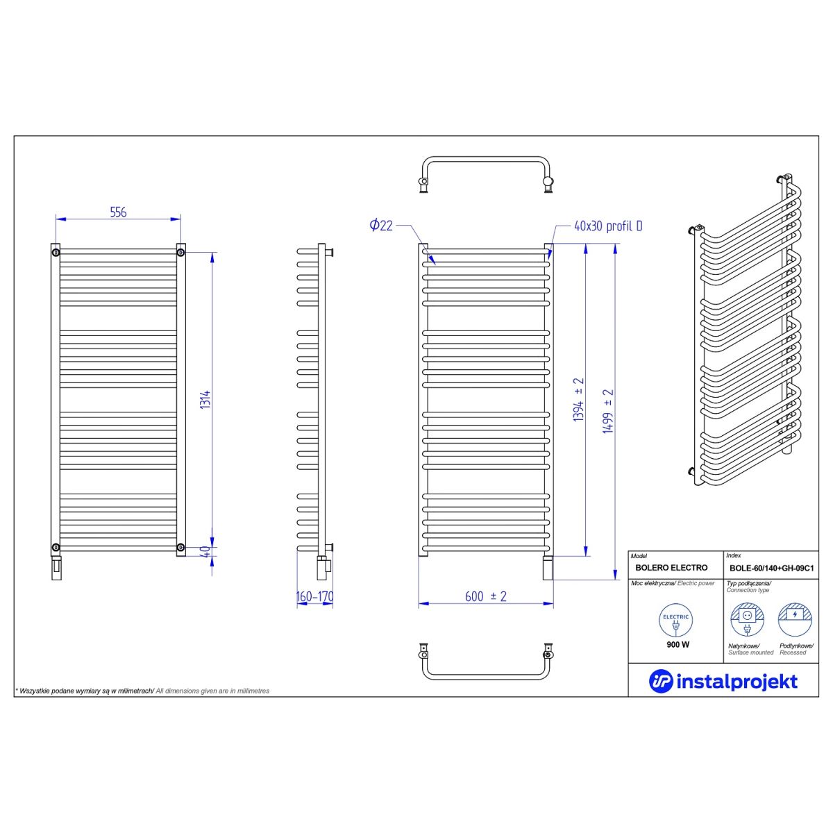 Instal Projekt Bolero Electro Elektrischer Heizkörper 139.4x60 cm weiß BOLE-60/140+GH-09C1