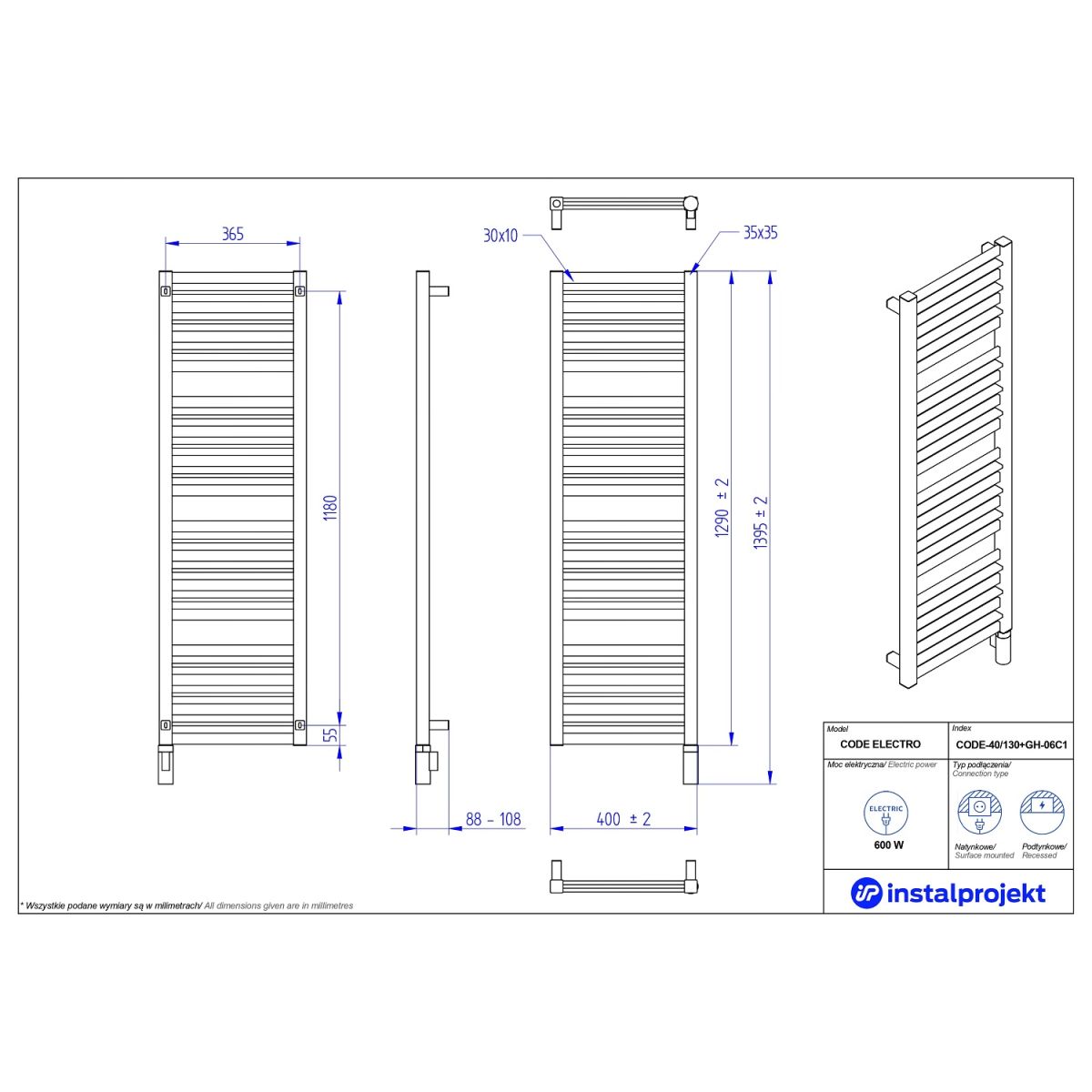 Instal Projekt Code Electro Elektrischer Heizkörper 129x40 cm weiß CODE-40/130C34+GH-06C1