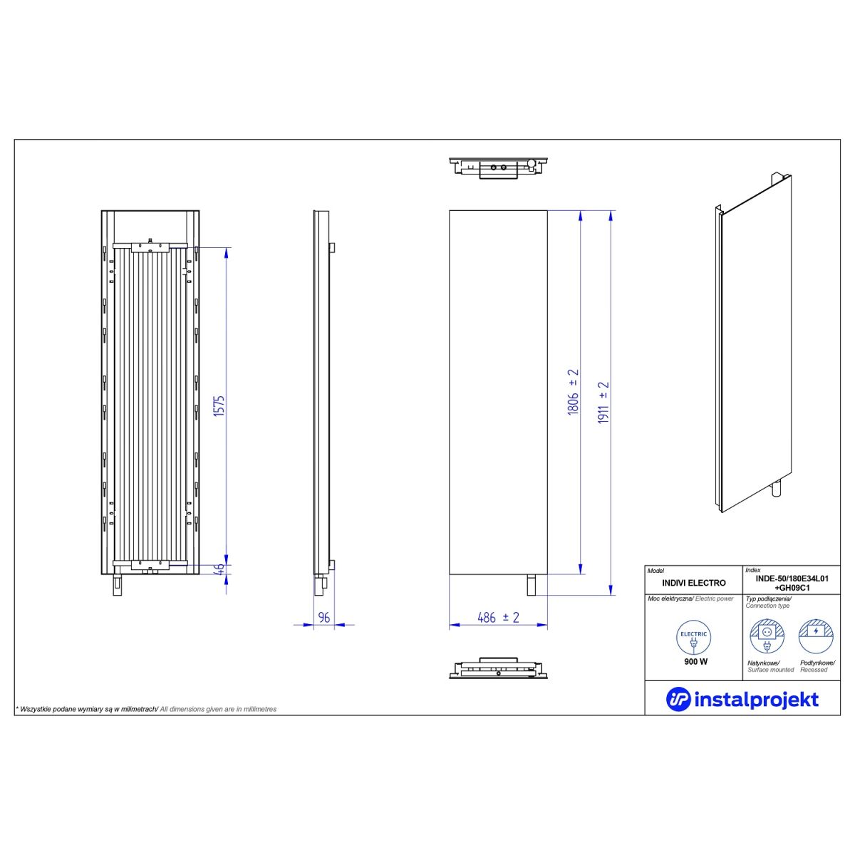 Instal Projekt Indivi Electro Elektrischer Heizkörper 180.6x48.6 cm weiß INDE-50/180E34L01+GH-09C1