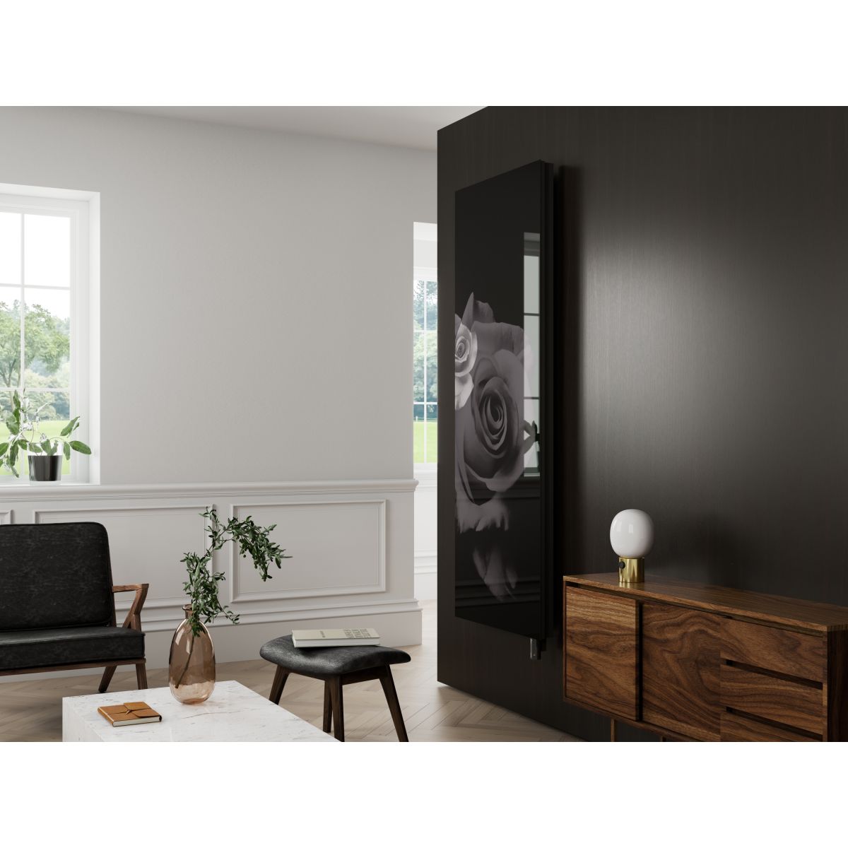 Der Heizkörper Inventio Electro Romantic zeichnet sich durch ein gewagtes Design aus, das jedoch subtil und sinnlich wirkt. Dieses Design ist wie geschaffen für unkonventionelle Innenräume und anspruchsvolle Kunden, die in typischen Gebrauchsgegenständen einen Hauch von Kunstfertigkeit suchen. Auf der glatten Glasfront haben die Designer Marcin Paprocki und Mariusz Brzozowski ein zeitloses Symbol für Liebe und Sinnlichkeit platziert: Rosen. Der graue Farbton der Blumen passt hervorragend zum Schwarz des Bildschirms und schafft eine äußerst elegante und zugleich minimalistische Kombination. In dieser Schlichtheit verbirgt sich jedoch eine Fülle an Aussagekraft, dank der der Heizkörper Inventio Electro Romantic eine zeitlose Investition ist, da wir ein modisches und stilvolles Gebrauchsgegenstand in unserem Interieur haben.