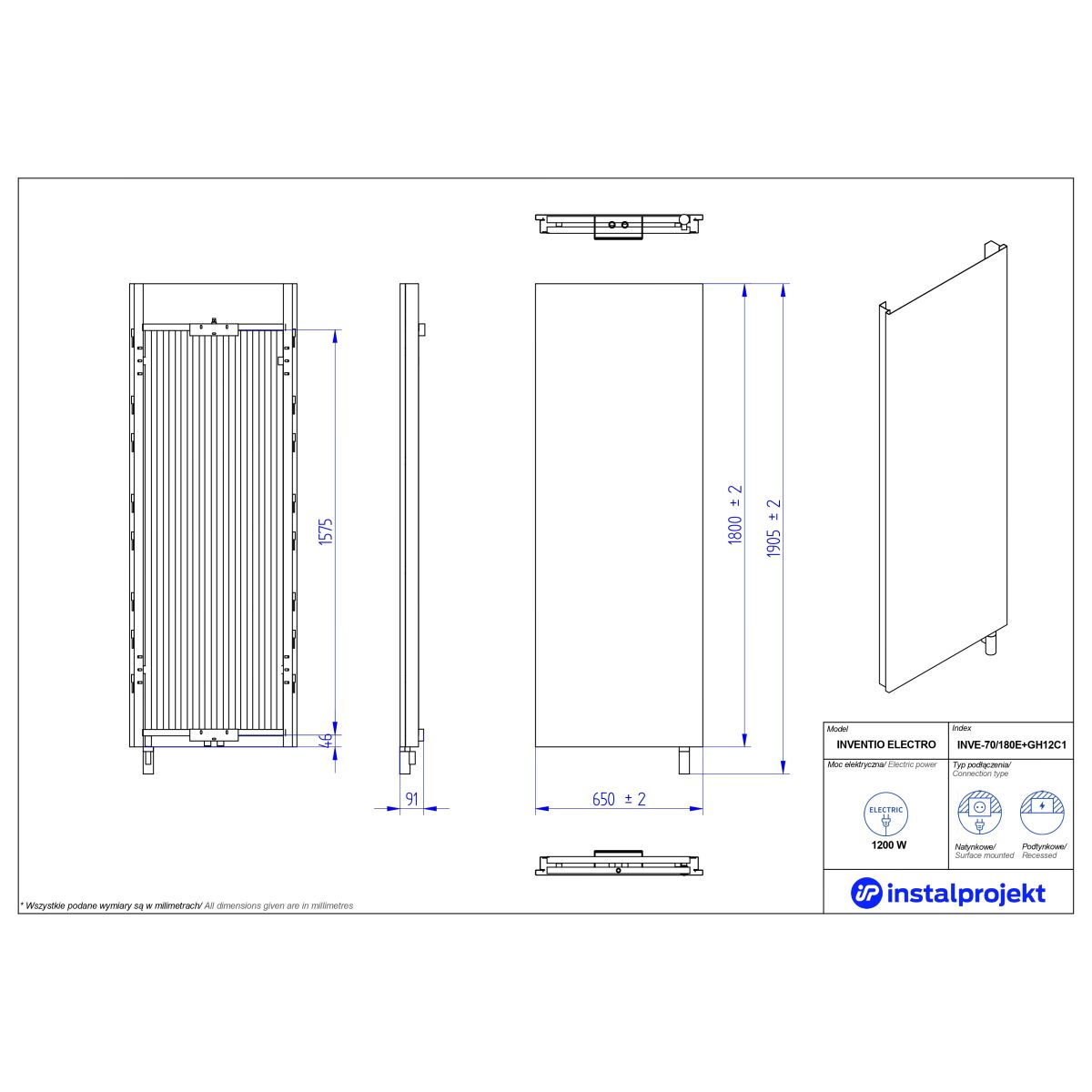 Instal Projekt Inventio Electro Elektrischer Heizkörper 180x65 cm weiß-schwarz INVE-70/180E75+GH-12C2