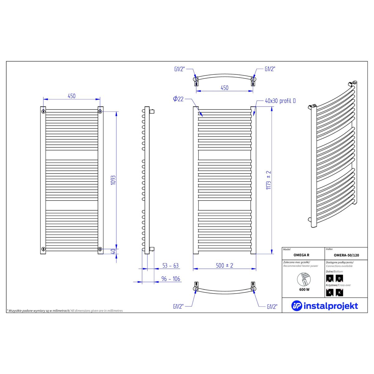 Instal Projekt Omega R Badezimmerheizkörper Leiter 117.3x50 cm weiß OMERA-50/120