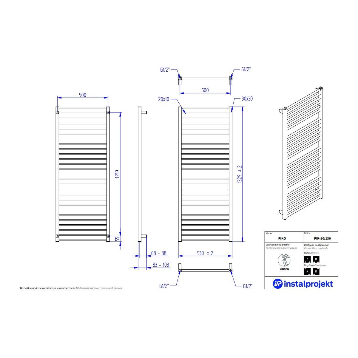 - Anschlussabstand: 500 mm