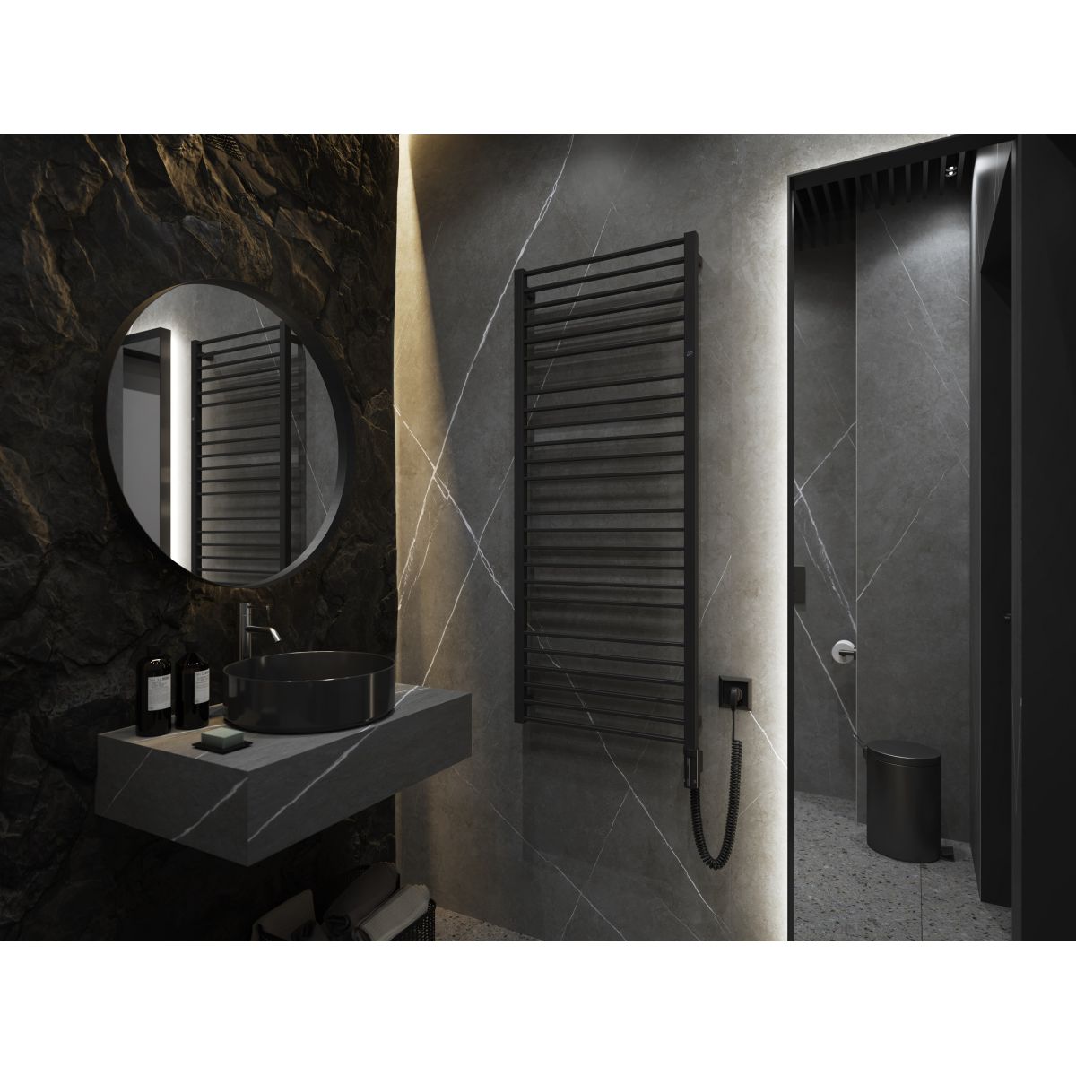 - Ausgestattet mit einem elektrischen Heizelement mit Thermostat und Spiralkabel (3x0,75) in Schwarz mit Standard-Uni-Schuko-Stecker