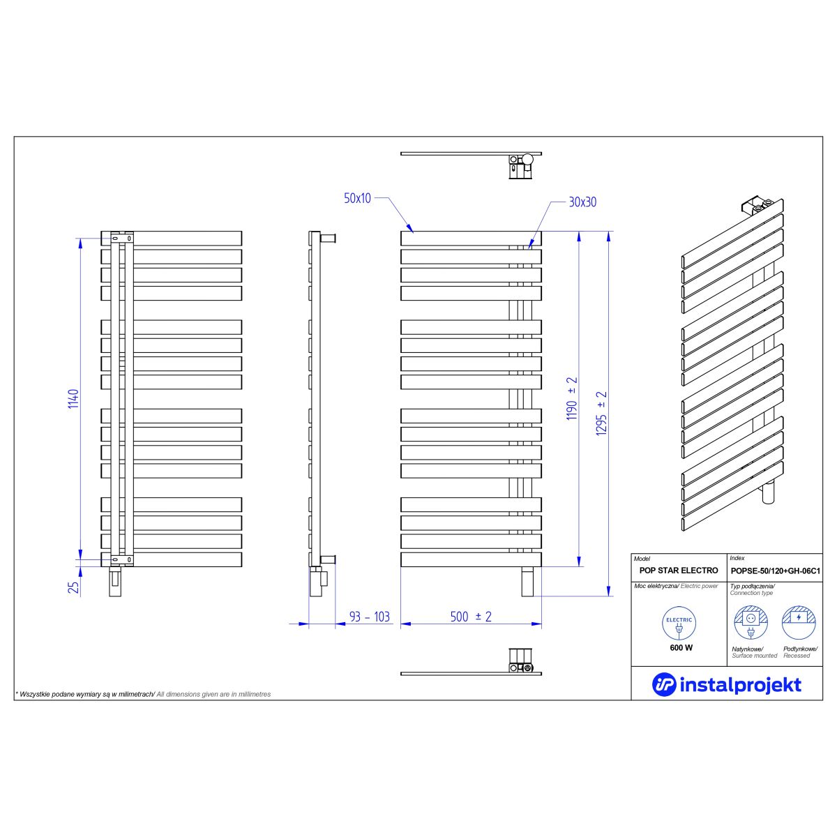 Instal Projekt Pop Star Electro Elektrischer Heizkörper 119x50 cm schwarz POPSE-50/120C31+GH-06C2