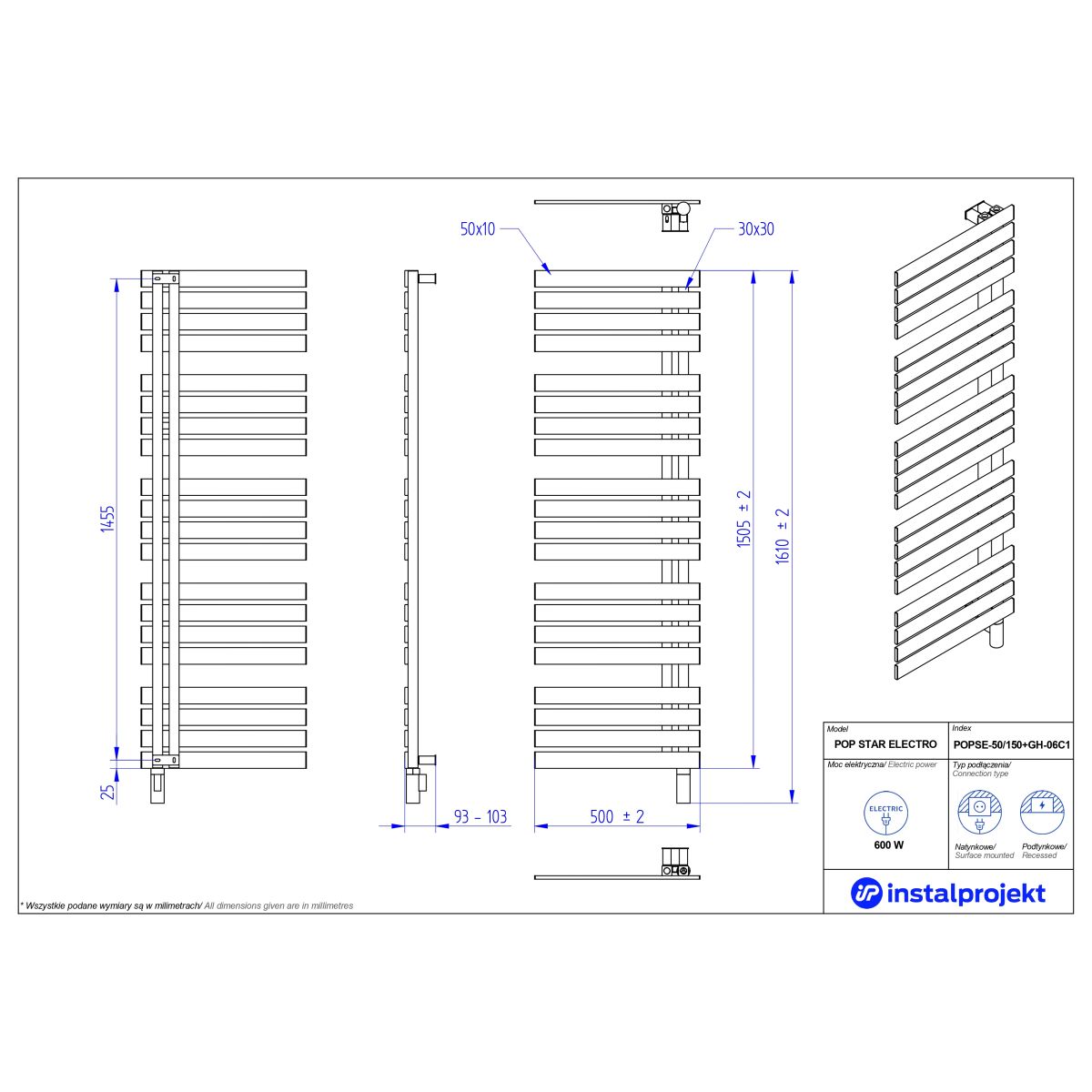 Instal Projekt Pop Star Electro Elektrischer Heizkörper 150.5x50 cm weiß POPSE-50/150+GH-06C1