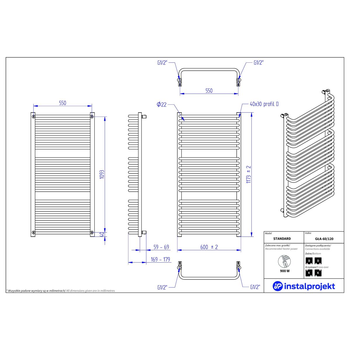 Instal Projekt Standard Badezimmerheizkörper Leiter 117x60 cm weiß GŁA-60/120