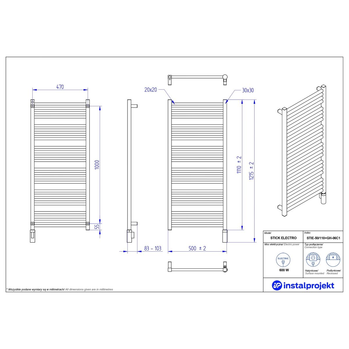 Instal Projekt Stick Electro Elektrischer Heizkörper 111x50 cm weiß STIE-50/110C34+GH-06C1