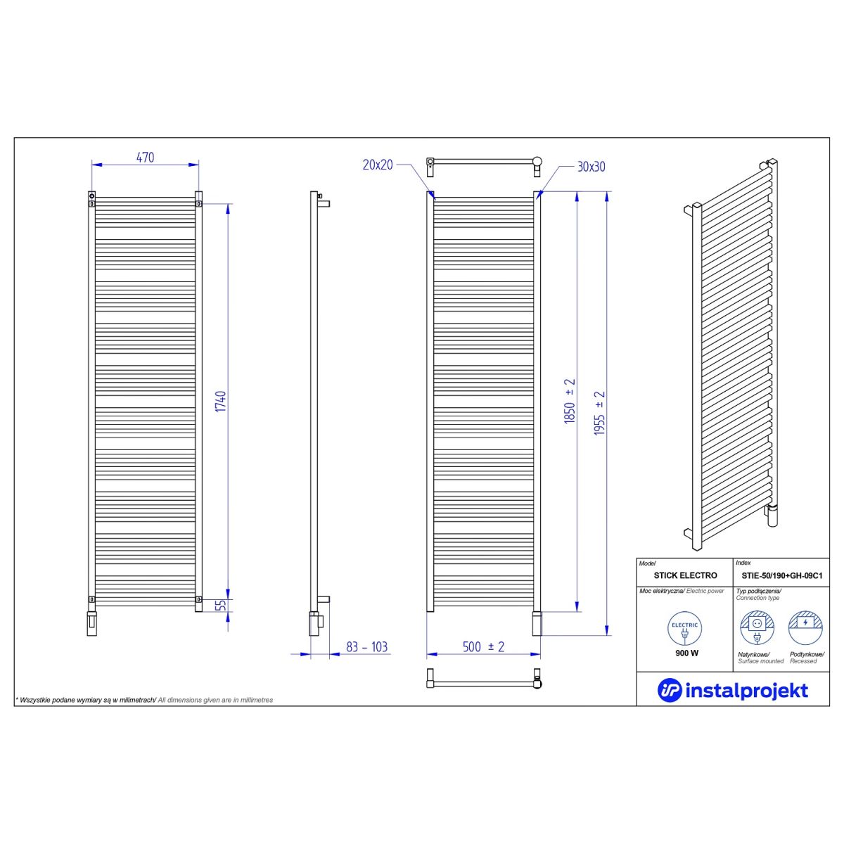 Instal Projekt Stick Electro Elektrischer Heizkörper 185x50 cm weiß STIE-50/190C34+GH-09C1