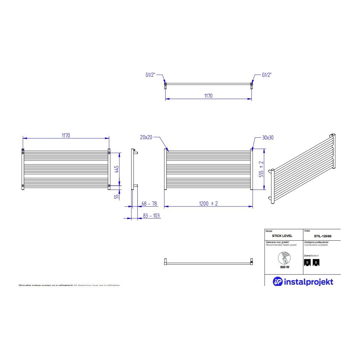 - Anschluss unten, Abstand 1170 mm