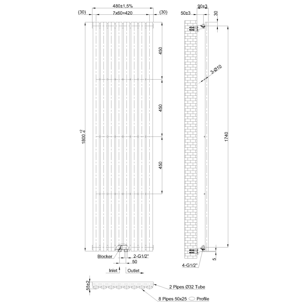 Invena Badezimmerheizkörper dekorativ 180x48 cm schwarz UG-10-C18