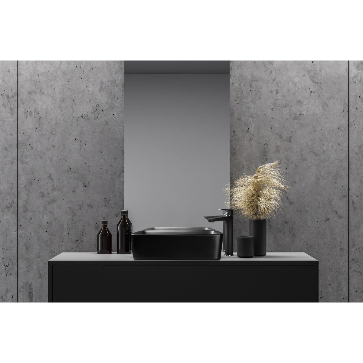 Paros ist ein schwarzes Waschbecken, das auf die Arbeitsplatte gestellt wird. Wenn wir dazu schwarze Badarmaturen kombinieren, schaffen wir mit Sicherheit einen modischen und sehr modernen Waschbeckenbereich. Paros ist ein Modell mit rechteckiger Form, das Liebhaber geometrischer Formen begeistern wird.