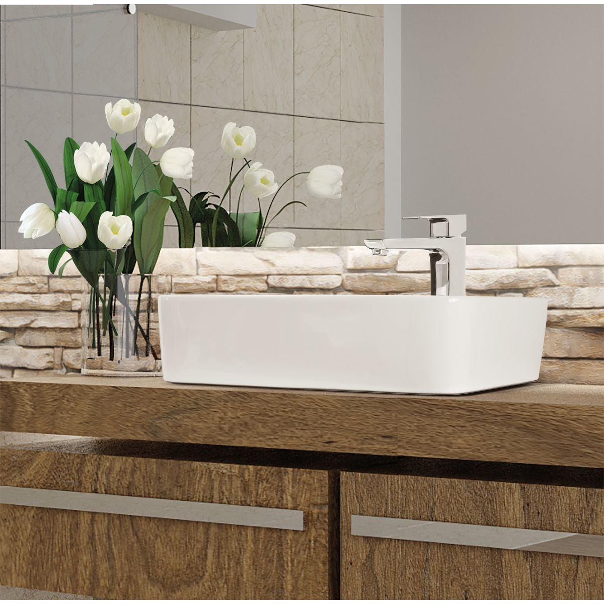 Das Aufsatzwaschbecken Paros wird Liebhaber geometrischer Formen begeistern. In Kombination mit einer hohen Waschtischarmatur lässt sich damit eine elegante und moderne Einrichtung gestalten.