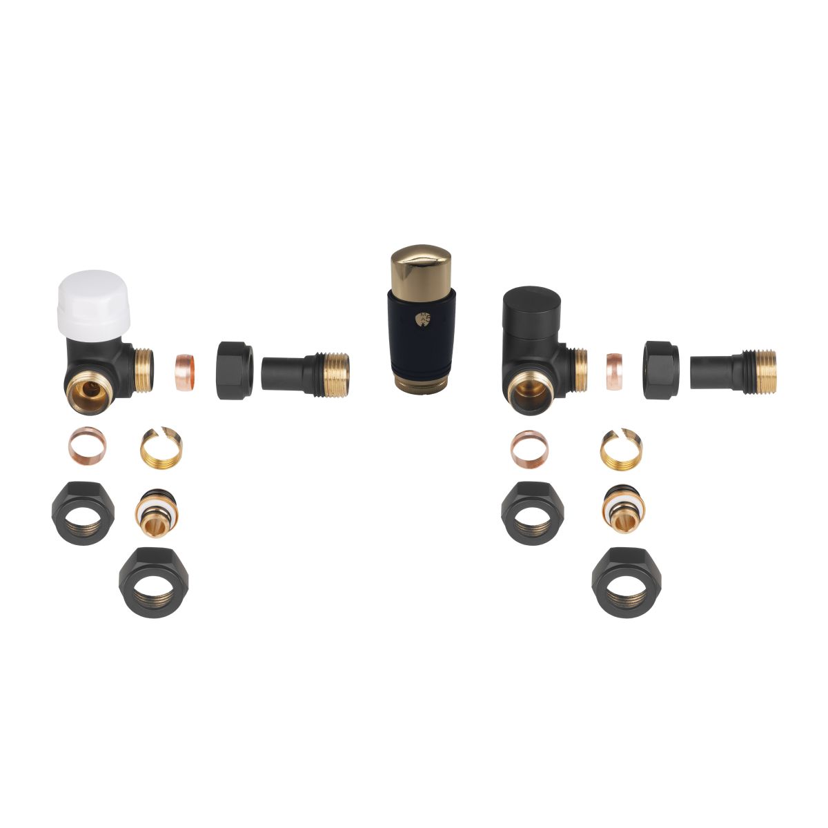Das exklusive schwarze Thermostat-Set vom Typ Duoplex ist für den Anschluss von dekorativen Badheizkörpern, aber auch für den Anschluss von dekorativen, von unten gespeisten Flachheizkörpern vorgesehen. Es handelt sich um ein reversibles Set, was bedeutet, dass es mit dem Kopf auf der linken oder rechten Seite verwendet werden kann.