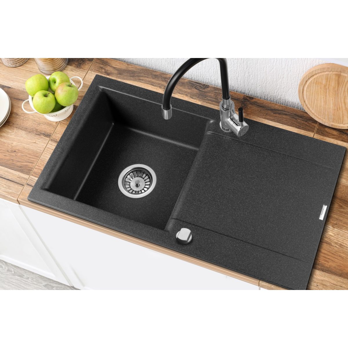 Einbeck-Spülbecken aus Granit, Tesalia, schwarz gesprenkelt, mit automatischem Siphon