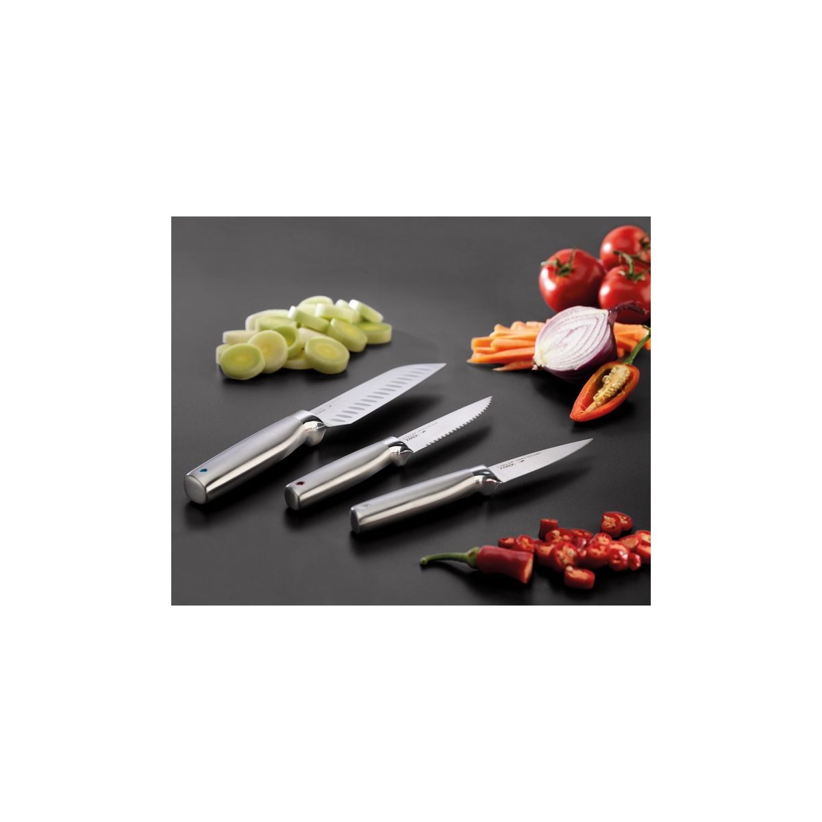 - Klingen aus japanischem Edelstahl, Stahlgriffe,
