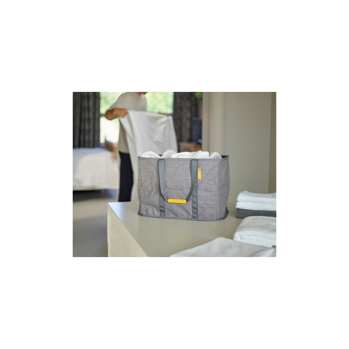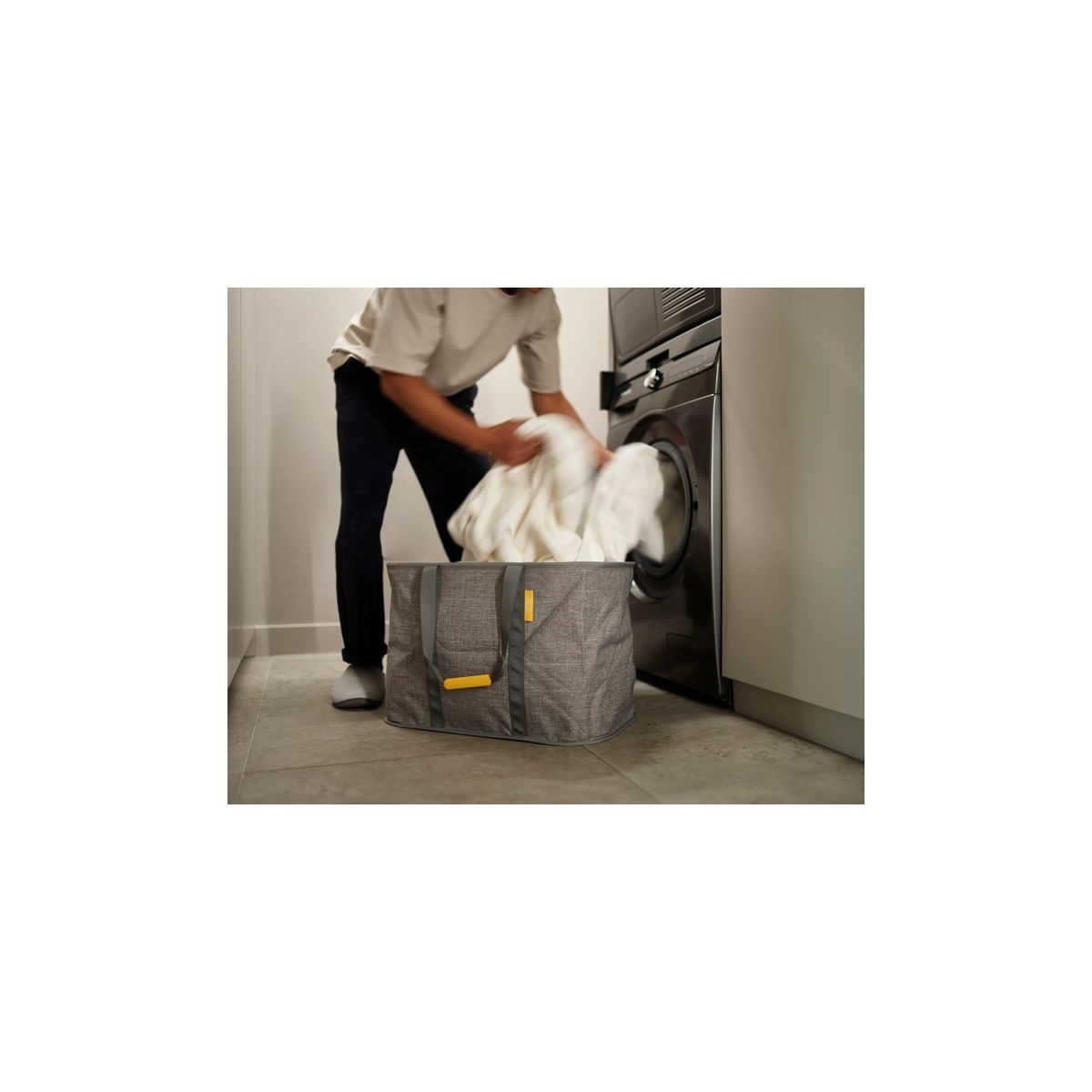 - Dank der robusten Griffe lässt sich die Wäsche leicht mit einer Hand tragen.