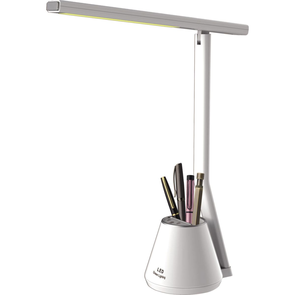 - Die schlichte Form der Lampe wird durch einen Becher ergänzt, der gleichzeitig als Stifthalter und Lampenfuß dient.