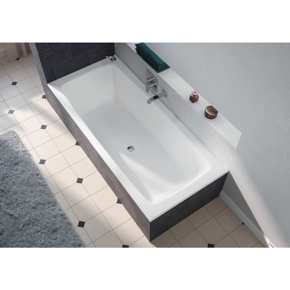 Moderne, rechteckige Form mit klar definierten Konturen. Aufgrund ihrer Innenform ist die Badewanne äußerst geräumig, was für hohen Badekomfort sorgt. Identische Rückenstützen und ein Abfluss in der Mitte garantieren ein bequemes Bad zu zweit. Passt perfekt zu den Produkten der Cayono-Familie.