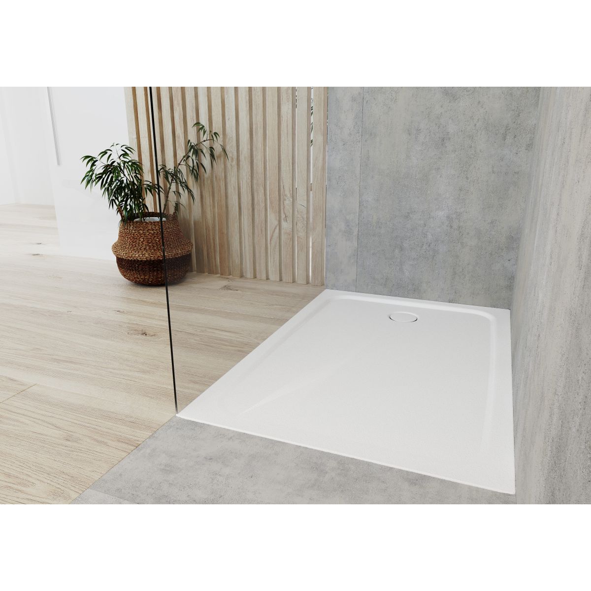 Flache Duschwanne in klassischem Design mit Ablauf in der Mitte der kürzeren Seite. Großzügige, homogene Standfläche. Perfekt abgestimmt auf die Produkte der Cayono-Familie.