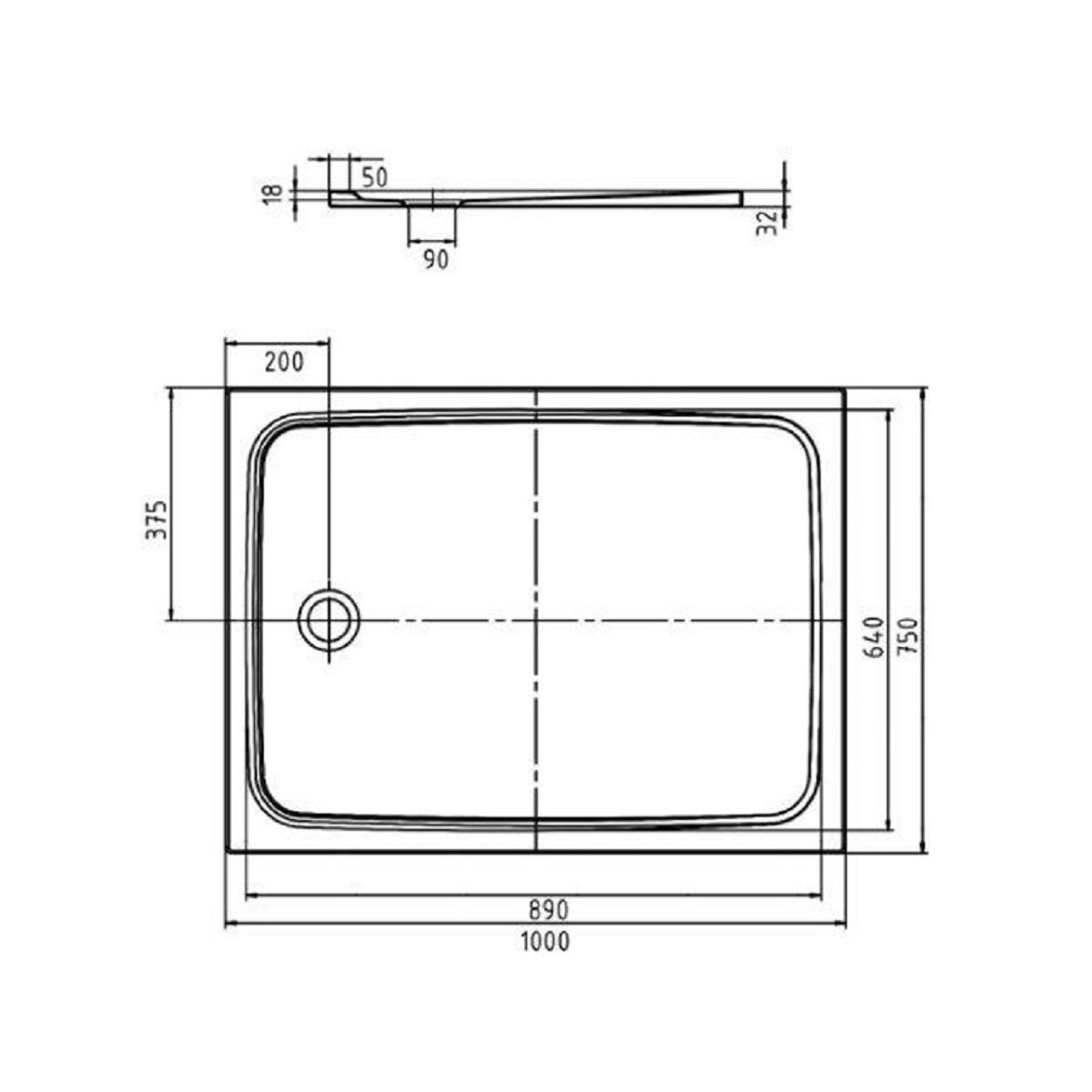 Flache Duschwanne in klassischem Design mit Ablauf in der Mitte der kürzeren Seite. Großzügige, homogene Standfläche. Passt ideal zu den Produkten der Cayono-Familie.