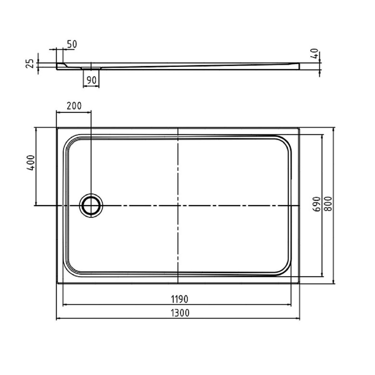 Flache Duschwanne im klassischen Design mit einem Abfluss in der Mitte der kürzeren Seite. Geräumige, homogene Standfläche. Passt perfekt zu den Produkten der Cayono-Familie.