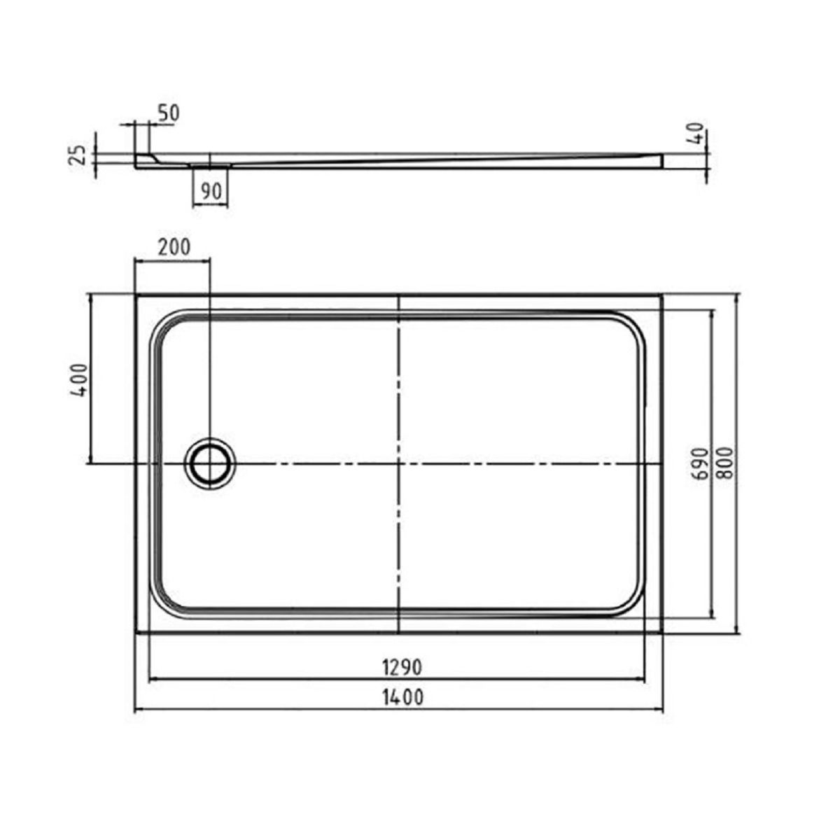 Flache Duschwanne in klassischem Design mit Ablauf in der Mitte der kürzeren Seite. Großzügige, homogene Standfläche. Perfekt abgestimmt auf die Produkte der Cayono-Familie.