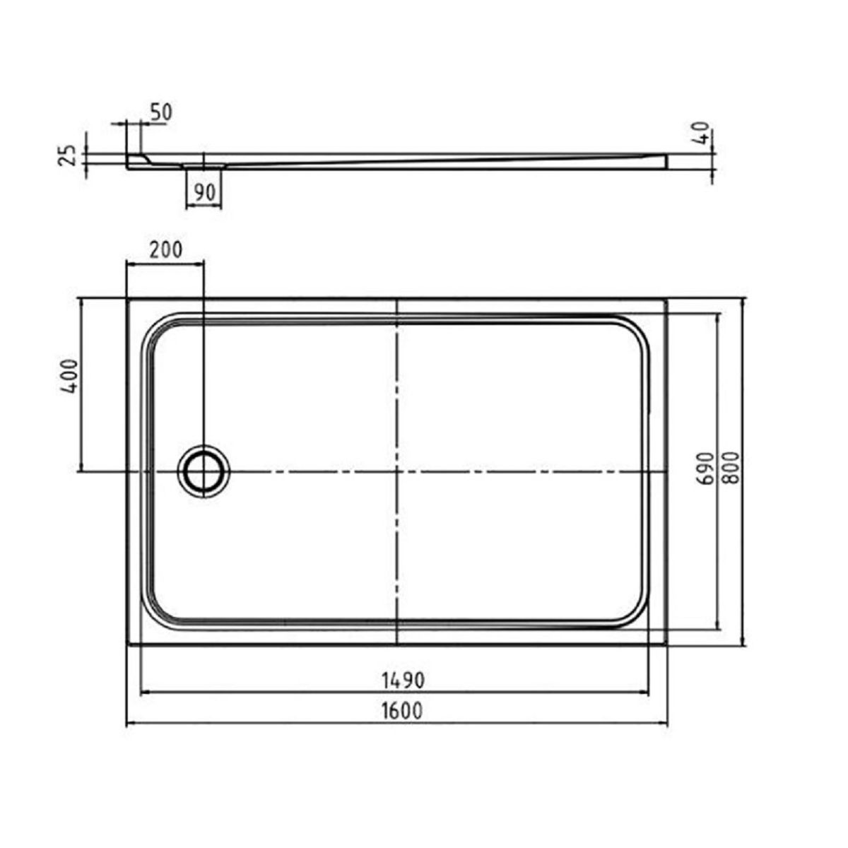Flache Duschwanne in klassischem Design mit Ablauf in der Mitte der kürzeren Seite. Geräumige, homogene Standfläche. Passt ideal zu den Produkten der Cayono-Familie.