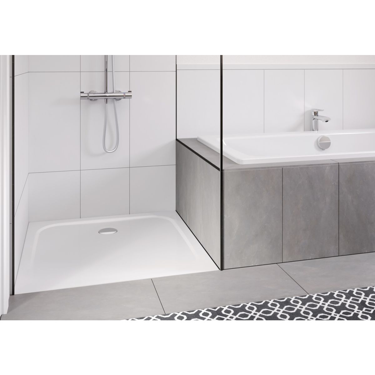 Flache Duschwanne in klassischem Design mit Ablauf in der Mitte der kürzeren Seite. Großzügige, homogene Standfläche. Passt ideal zu den Produkten der Cayono-Familie.